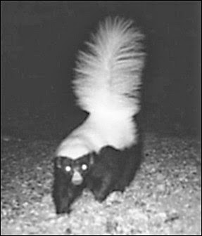 But it turns out that skunks don't really need a confrontation to spray. They do it for territorial marking, to leave a calling-card to other animals, or skunks, that they're there, or have been there. Invariably, the skunks seem to prefer our yard to others in the area, though I may simply be feeling persecuted here.