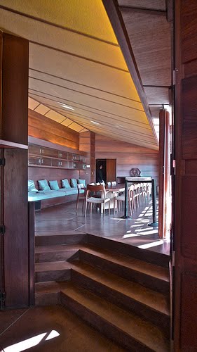 Another aspect of the odd angles is tight corners. Philip Johnson believed in what he called the "processional" quality of architectural design, by which he meant the incremental unfolding of views and proprioceptive awareness of space, as in a procession. As we move through a space, our sense of how we feel, is a process, i.e., not a static, fixed point of reference, but a constantly shifting perspective. Transitions from one point to another allow a structure to be perceived kinetically. In the Hanna house, our movement through the house presents a constantly changing view of the outside, such that there's a continuing conversation between external and internal areas. There's an insistence upon this exposed quality, which some might find intrusive. The whole house itself is an escape, but once within its limits, there seems almost no privacy.