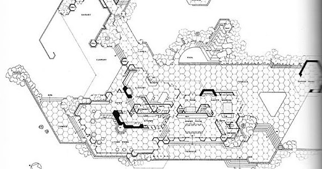The "germ" of the design is visible in the hexagonal terrace tiles, which fit perfectly into the perimeter wall angles. This visual queue is probably not initially obvious to a visitor to the site, but it becomes more and more confirming as you move around, and inside the structure. The idea of imposing a design principle onto a site, while maintaining the functional organization of space, is like the golden section. It makes the existence of such a house almost a natural expression of the land itself, almost "inevitable" in its realization of possible form(s).