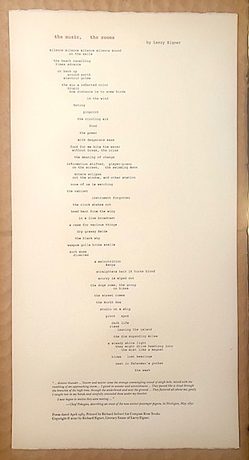 In 1965, Larry Eigner published The Music, The Rooms. It was later issued as a folding broadside, which of course has been out of print for many years. I've always regarded it as Eigner's finest poem of some length. Though he wrote other poems of approximately this length--poems perhaps 2 pages long--this one seems particularly dense and involved--un-typically so, given the nature of his writing style.