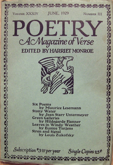 It's interesting to go back and browse old literary magazines from the first half of the 20th Century. 19th Century American and British literary magazines now seem impossibly remote, and alien to our sensibility, but it only takes a little imagination to conjure up a sense of what it may have felt like to read periodicals like Poetry (Chicago) Magazine, in the 1920's, which in those days had no internet (electronic) presence, and could only be read in its material text incarnation. There weren't many places that poetry could be published before World War I--nothing like the explosion of academic journals and little magazines which became increasingly common in the succeeding decades, reaching a crescendo in the 1960's with the mimeo revolution.