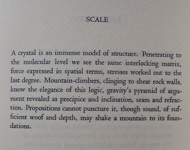 Later still, the experience of building a house would expand my understanding of the process of designing for oneself. Attempting to mediate between the architect's sense of who we were, what we wanted, and how that might be accommodated within the confines of a budget, was a mind-expanding experience--with the certainty that this would be our "last house" (in M.F.K. Fisher's phrase). "What are we in." In our bodies, our brains, our rooms, our houses. "Time is a room." Translucent, or opaque, large or small.