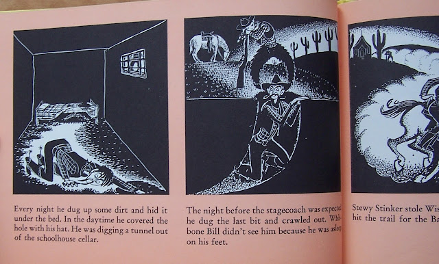 Burton's use of white-line on black background allows her to evoke a nightmarish mystery and foreboding. Darkness is associated with Stewy's gang, and their cattle-rustling (done at night), and Stewy (in his darkest hour) escaping from the black dungeon (in the cellar of the schoolhouse), by digging under the foundation in total blackness.