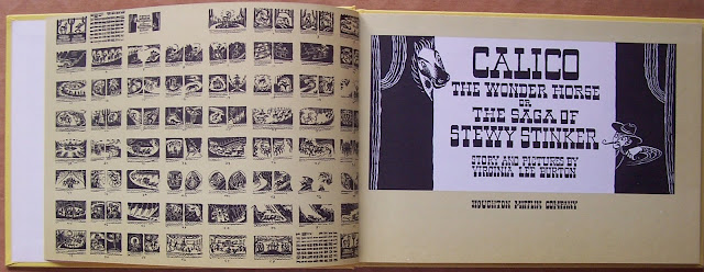 Calico the Wonder Horse or The Saga of Stewy Stinker draws on the cowboy myth, as well as the comic book styles of the 1930's, but not naively--with impressive sophistication. To summarize, it's the story of a horse who almost single-handedly saves a small Western town from a band of horse-thieves and a torrential natural flood, taming the outlaws and bringing peace and harmony back to Cactus County. Along the way, there are feats of derring-do, and lots of visual hijinks, as the forces of good and evil contend. There's also the trope of the miraculous domestic animal who is intelligent, courageous, loyal, and lucky.