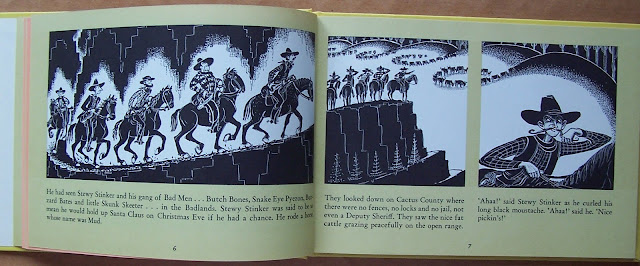 The values of community are emphasized, as in the end the newly tamed gang members are drawn into the town Christmas party at the local town hall. The power of community feeling to turn bad men into good, and draw them back into the life of the larger society is the underlying message of the tale. For Burton, family and community and socially integrated art are all intimately linked, and the integrated visual narrative of her children's books becomes the ideal medium to express this. But for me, the little morality play was primarily a cowboy cartoon, whose dreamlike world of unreal landscapes and intriguing perspectives drew me in to the curious and absorbing passageways of my own imagination.