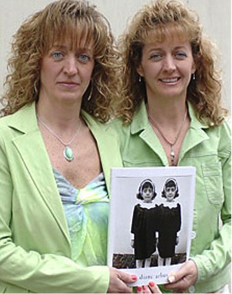 The two women below are of course the grown-up versions of the twins above, now probably in their early fifties (the picture may have been taken some years ago). In a weird way, they still resemble the sisters they were 45 years earlier. Or have they been reversed? Funny question. For my part, I can see the same personalities inside the faces, persevering over the decades, preserved in their facial magic. Can there be anything more mysterious or fascinating than human faces? Their unique portrait, done when they were just innocent, impressionable, and probably trusting young children, has made icons of their faces. They're almost as famously recognizable as minor movie stars. But not for the reasons that media personalities are. Something much stranger has happened to them. And to us. Arbus has seen something which the photograph reports with unerring fidelity. The flicker of reality is like the replicating frames of perception which comprise the experience of being alive, of seeing the zillions of light rays in which we're constantly bathed. There's a stillness at the center of all this flux, and the photograph reminds each of us of our isolation at that center. Everything revolves around us. Look in the mirror and who do you see? The irretrievable progress of what was, in all its particularity, now forever closed. The photograph is like a quick graph of a phenomenon that propagated itself from the tugging strands of microscopic DNA inside their mother's womb. At some intuitive level, could these two people always somehow feel the remorseless stretching apart of their common unity of template, splitting them into two isolate halves?